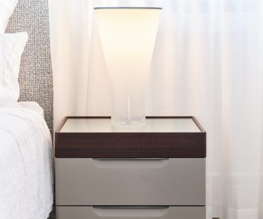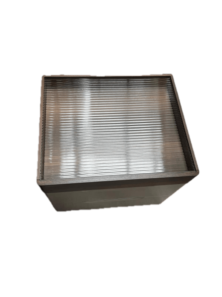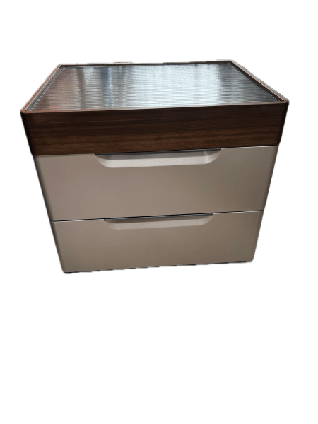 Clay colour 2 drawer side table with eucalyptus trim and fluted glass top