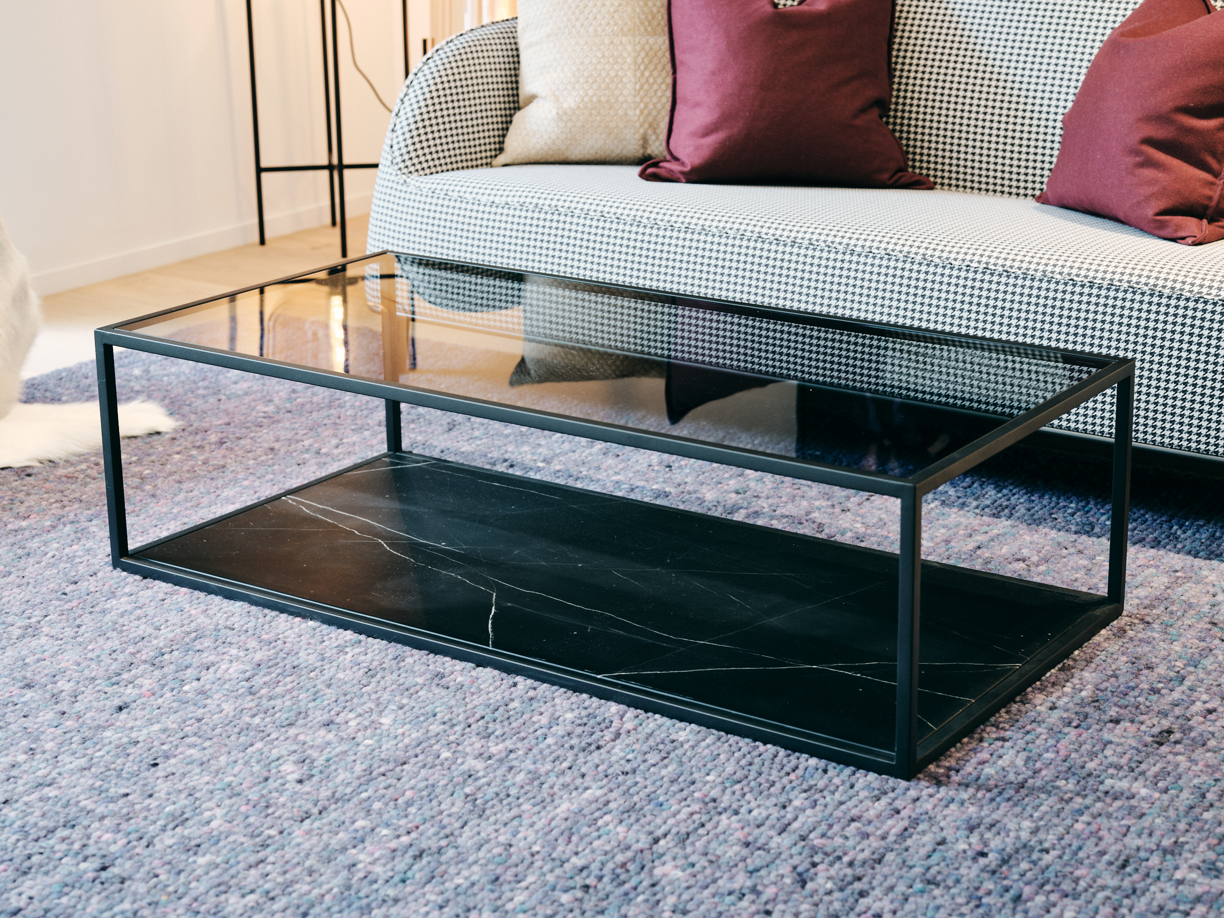 Rectangular smoke glass top on black metal frame with black marble base
