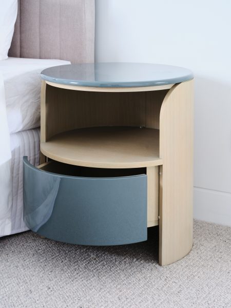 Brushed White Oak timber cylindrical table with Patina Green front draw/top