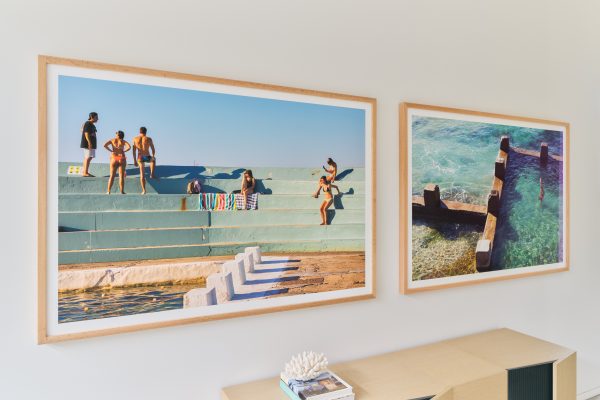 Photograph of sunbathers on green steps with striped towel framed in timber