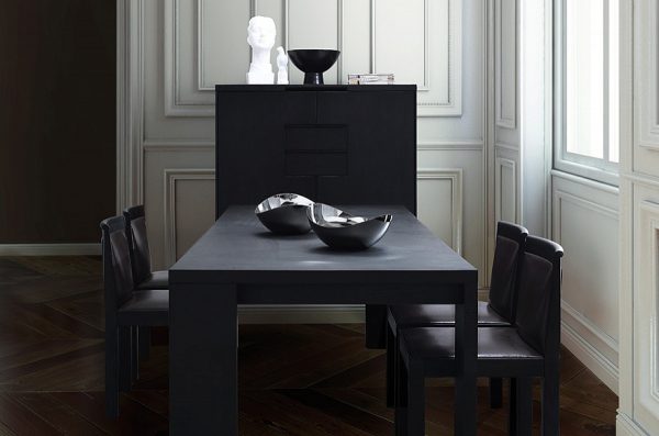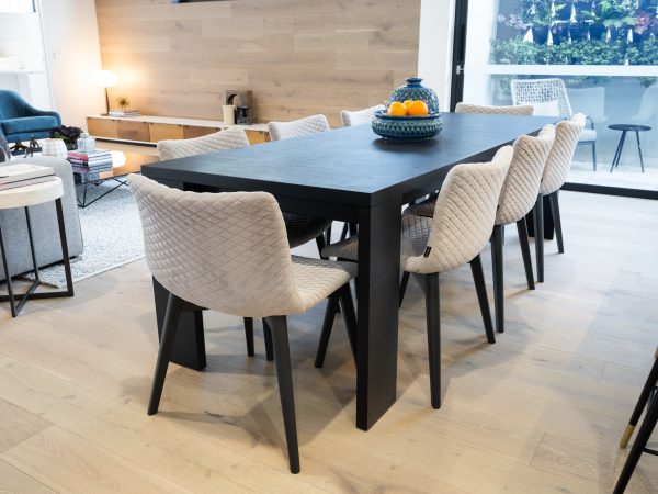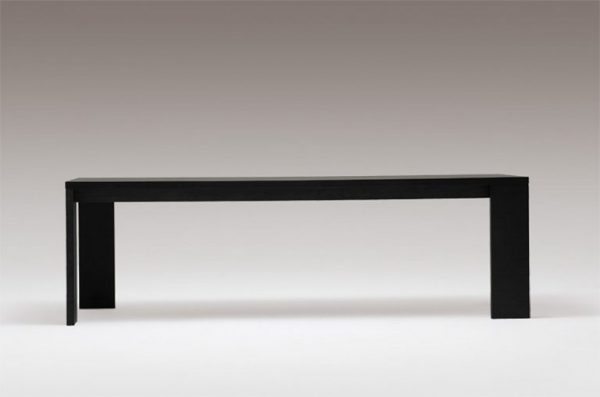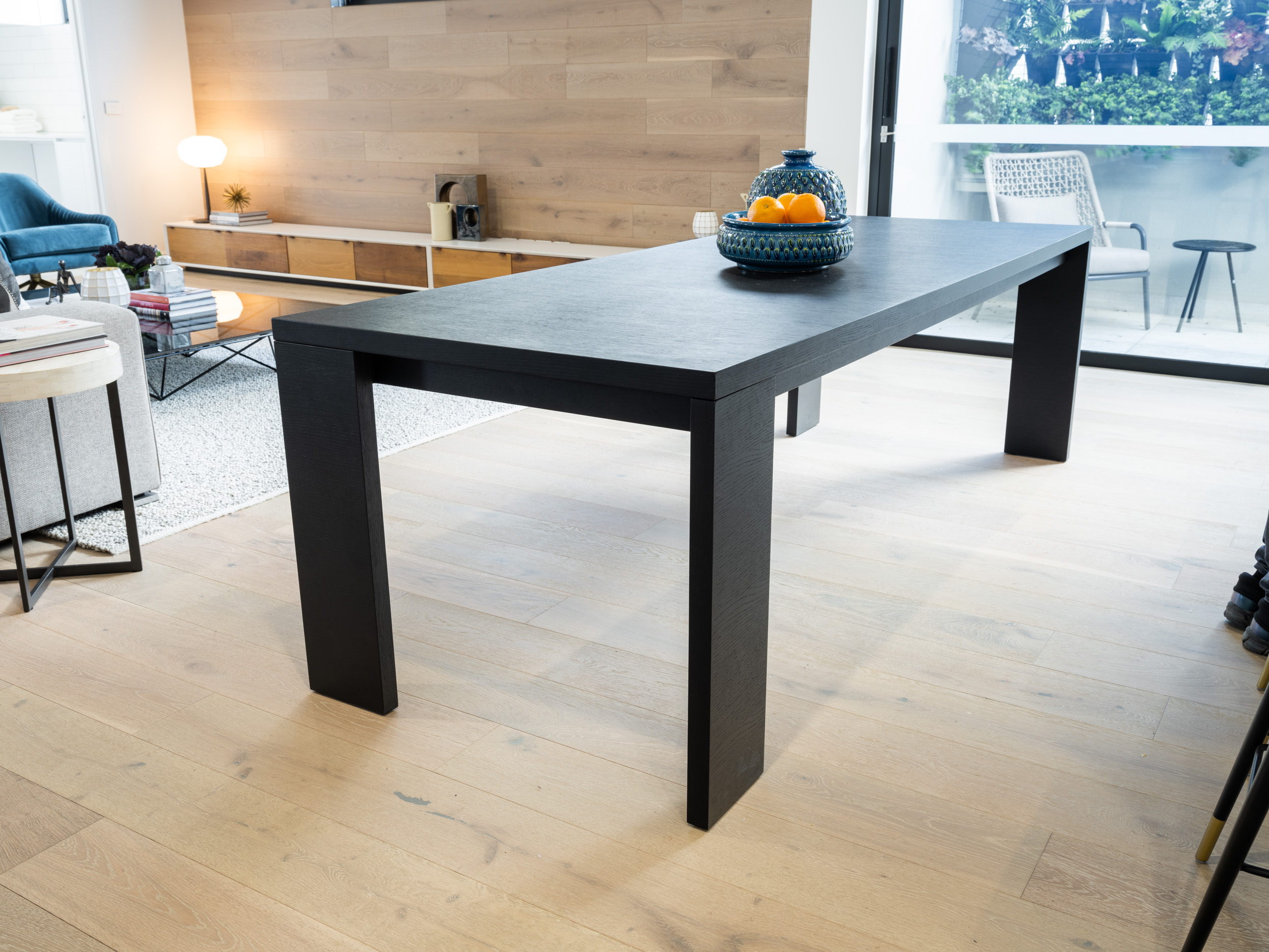 Black veneer top on Black oak legs set at perpendicular angles to each other