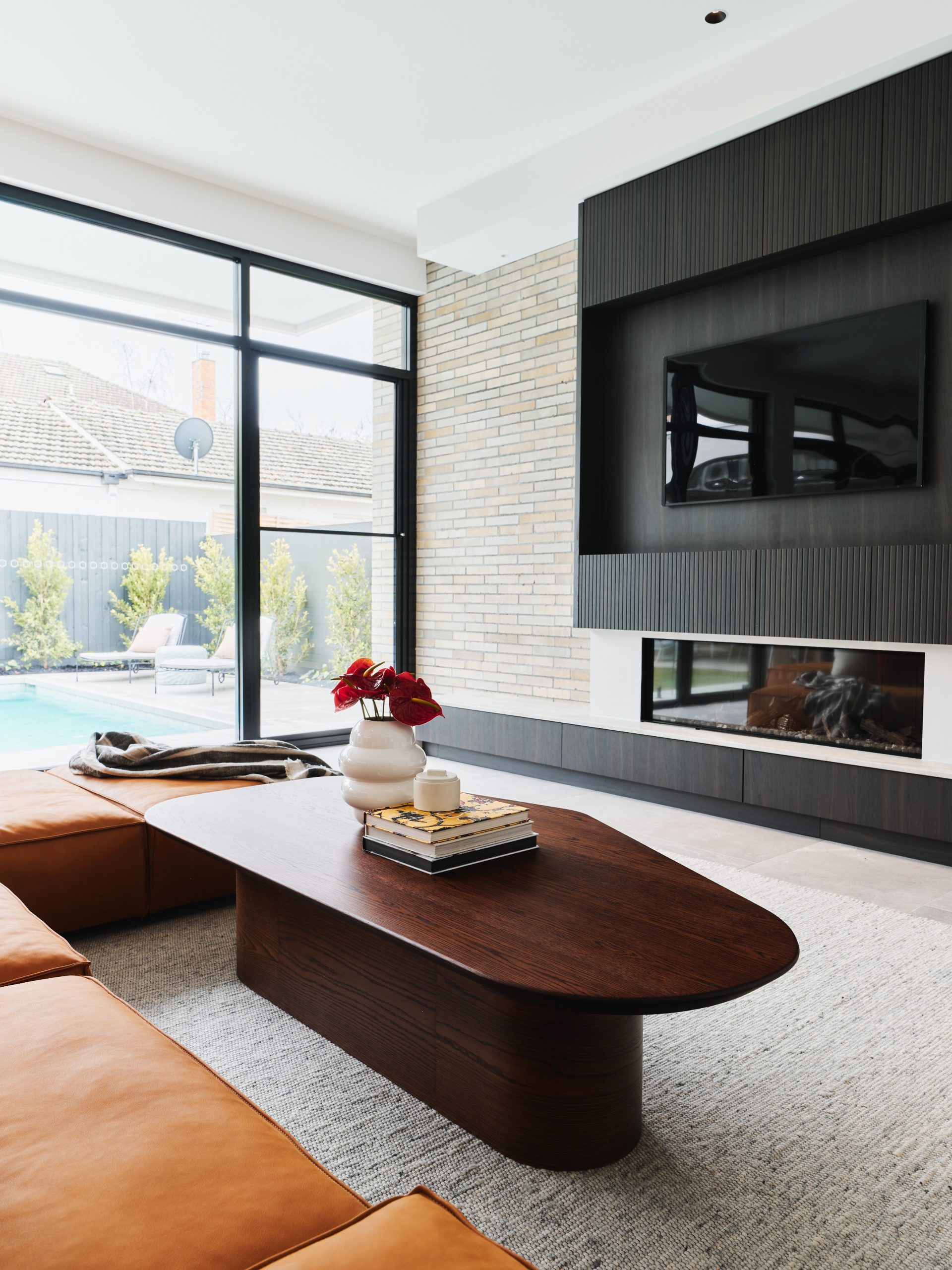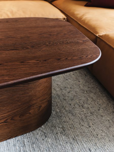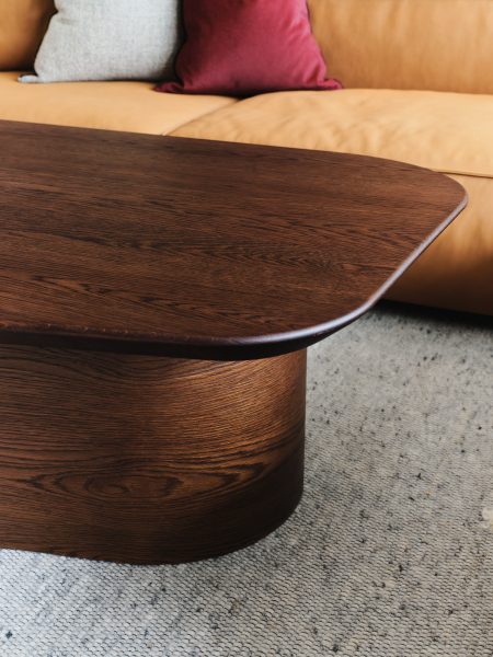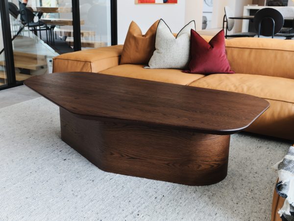 hazelnut colour timber shark nose asymmetric shape coffee table