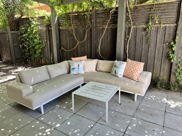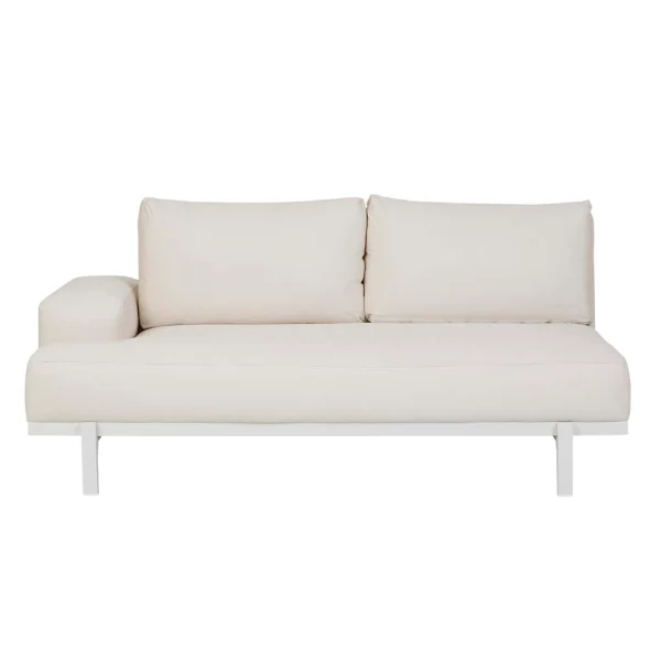 White aluminium chaise with Sunbrella canvas upholstery in Sand and quick-dry removable foam back cushions
