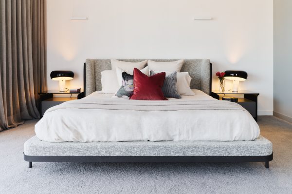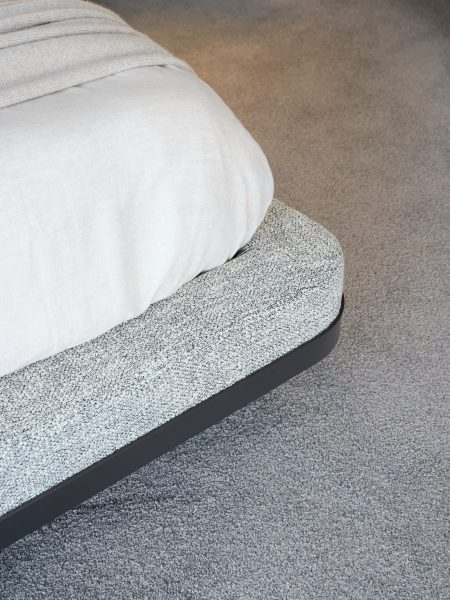 black/white boucle fabric and black leather bed frame with winged bedhead detail