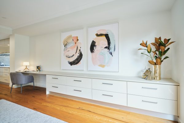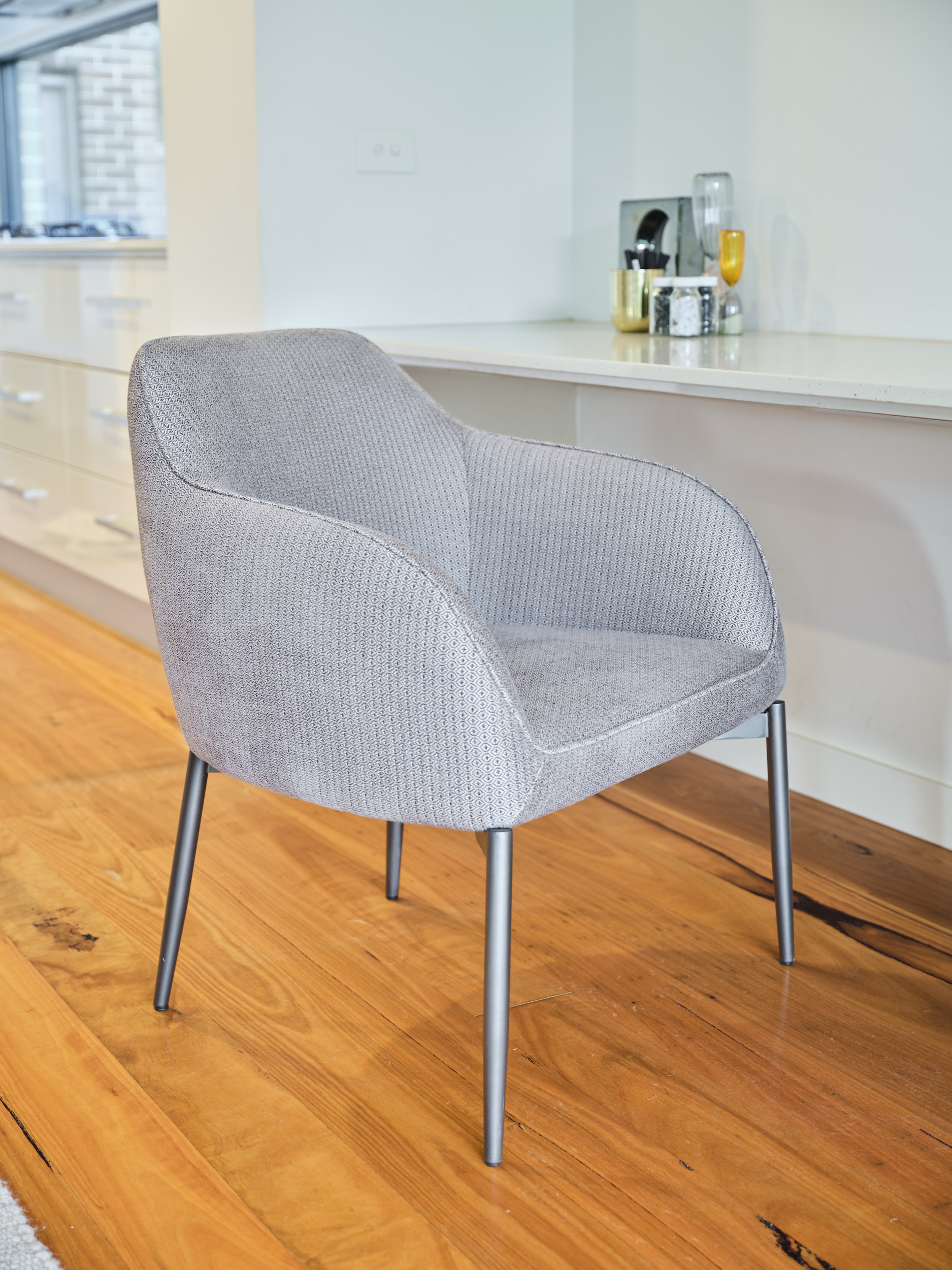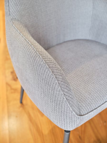 Mocha coloured patterned fabric upholstered seat and back on slim metal legs