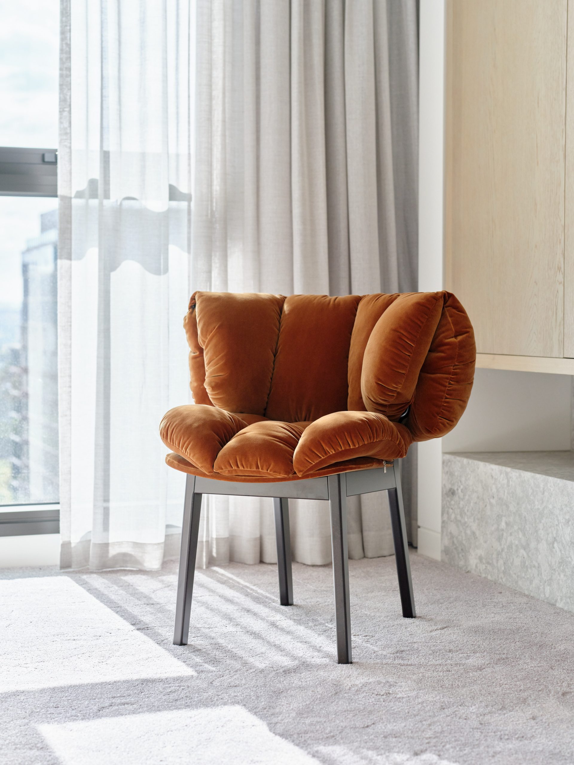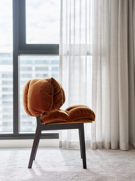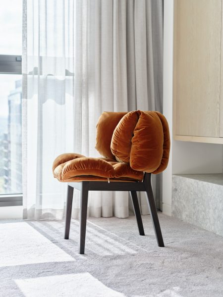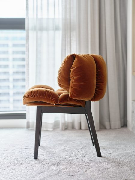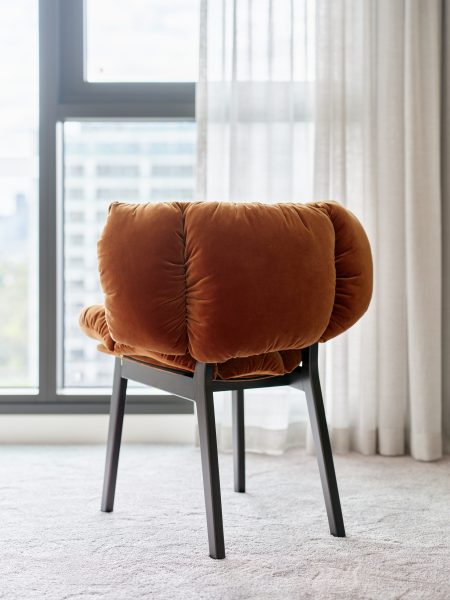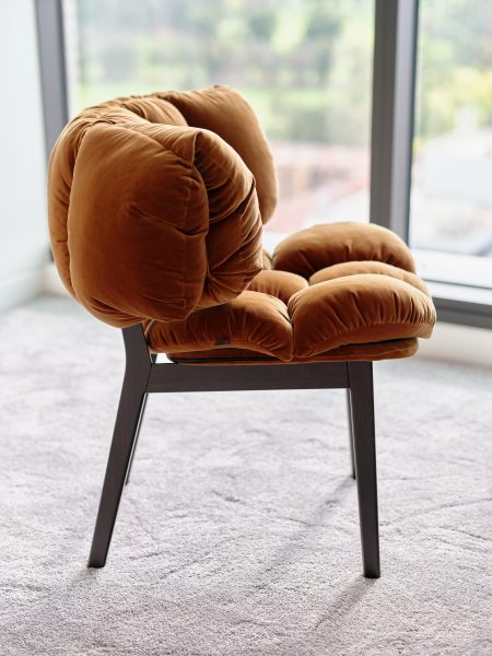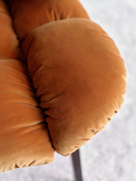 Amber velvet quilted puffy seat and back on timber legs