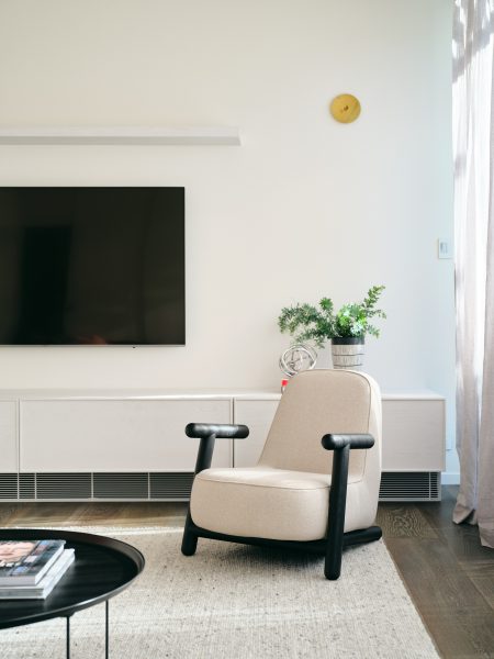 Grey fabric upholstered seat and back on rounded, solid timber frame