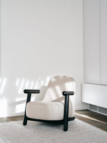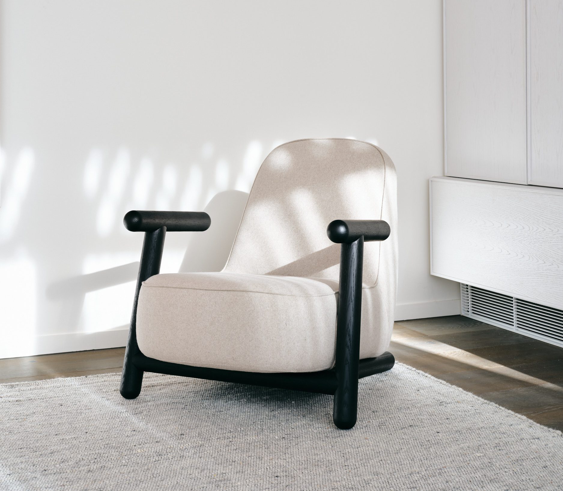 Grey fabric upholstered seat and back on rounded, solid timber frame