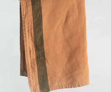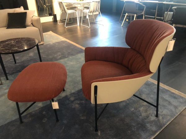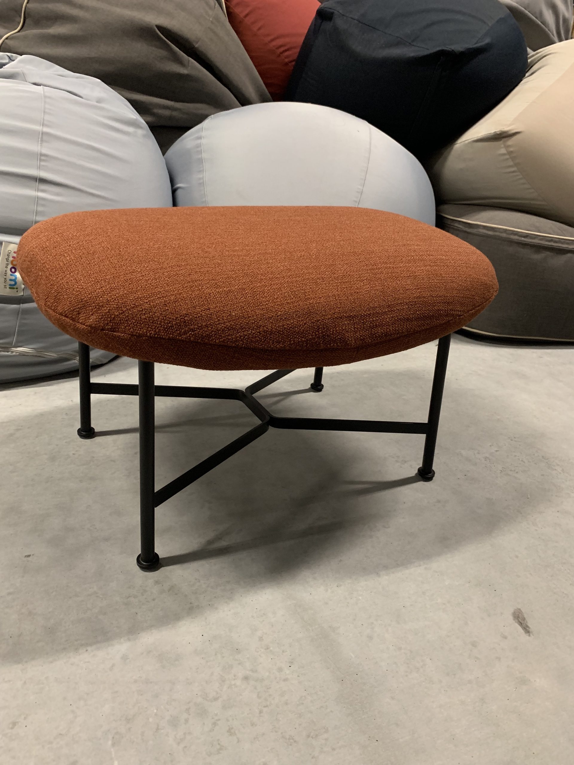 Rust orange upholstered ottoman on black slim legs