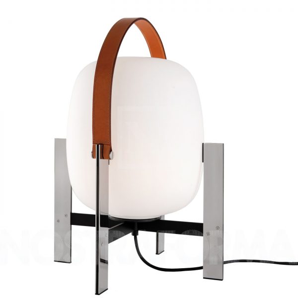 Frosted glass globe on silver metal stand with tan leather strap.