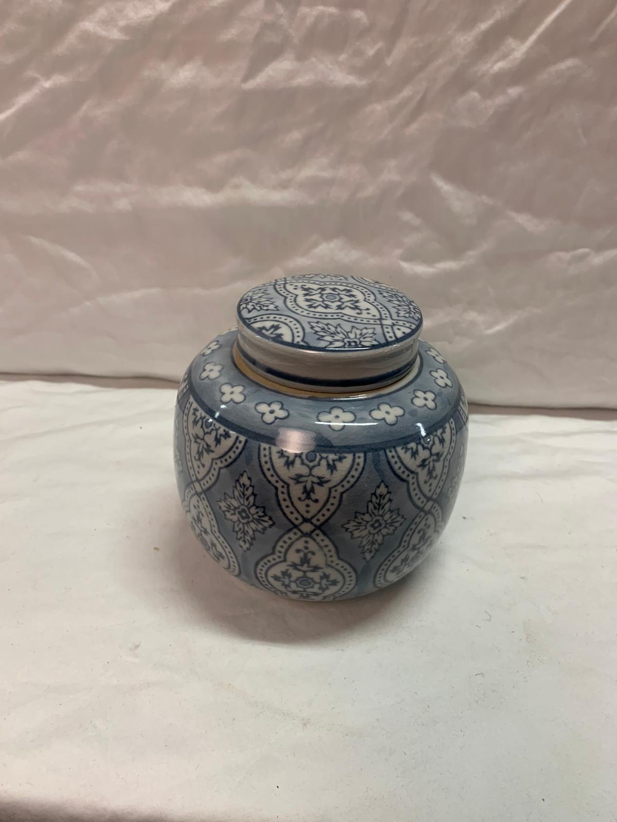 Decorative 1047 12.5cm Diam x 18cm H Blue ceramic ginger jar with white pattern Categories: Accessories, Decorative Description Description Related products Mia Read more Quick View Vase 1663 Read more Quick View Leather Read more Quick View