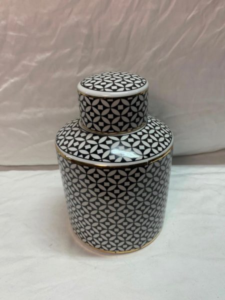Decorative 1064 15cm Diam x 22cm H Black/White patterned ceramic jar with gold trim Categories: Accessories, Decorative Description Description Related products Curl Star Read more Quick View Shoe 1026 Read more Quick View Harper Read more Quick View