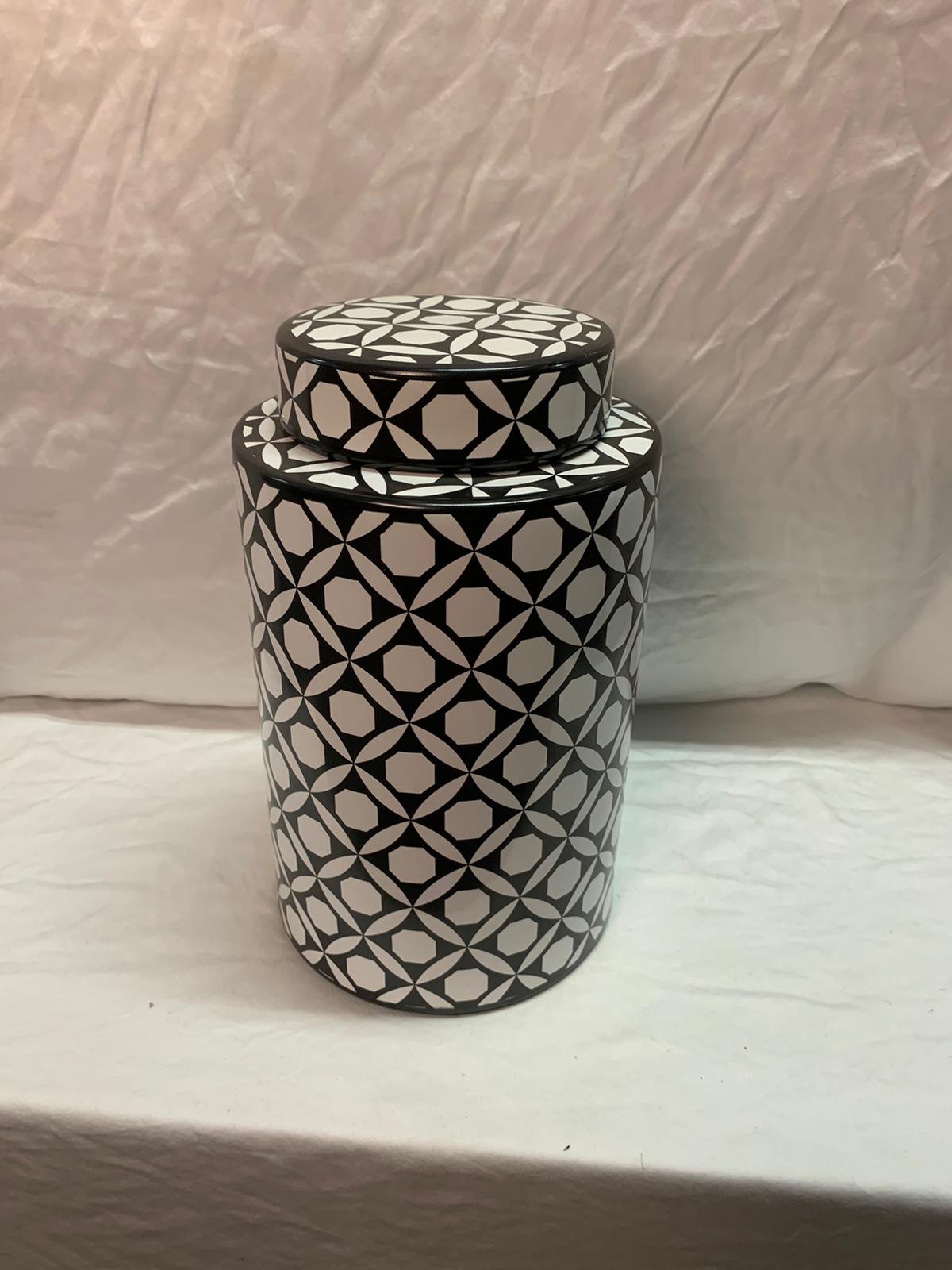 Decorative 1065 18cm Diam x 31cm H Black/White patterned jar with lid Categories: Accessories, Decorative Description Description Related products Bowl 1098 Read more Quick View Basket 1009 Read more Quick View Basket 1025 Read more Quick View