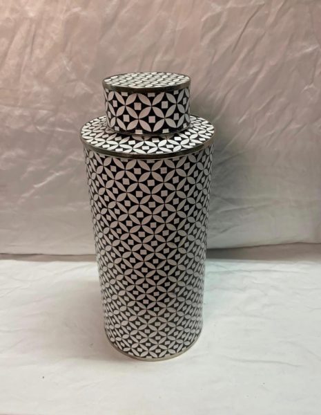 Decorative 1067 15cm Diam x 35cm H Black/White patterned metal jar with lid Categories: Accessories, Decorative Description Description Related products Dot Dot Dot Cushion – Pink Read more Quick View Starr Read more Quick View Brick Cushions – Green and Orange Read more Quick View