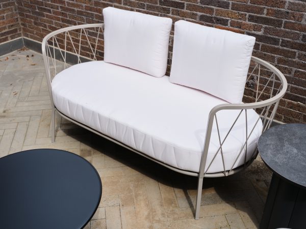 Mud Grey galvanised steel frame with diamond side detail available with removable seat and back cushions available in white or pale grey