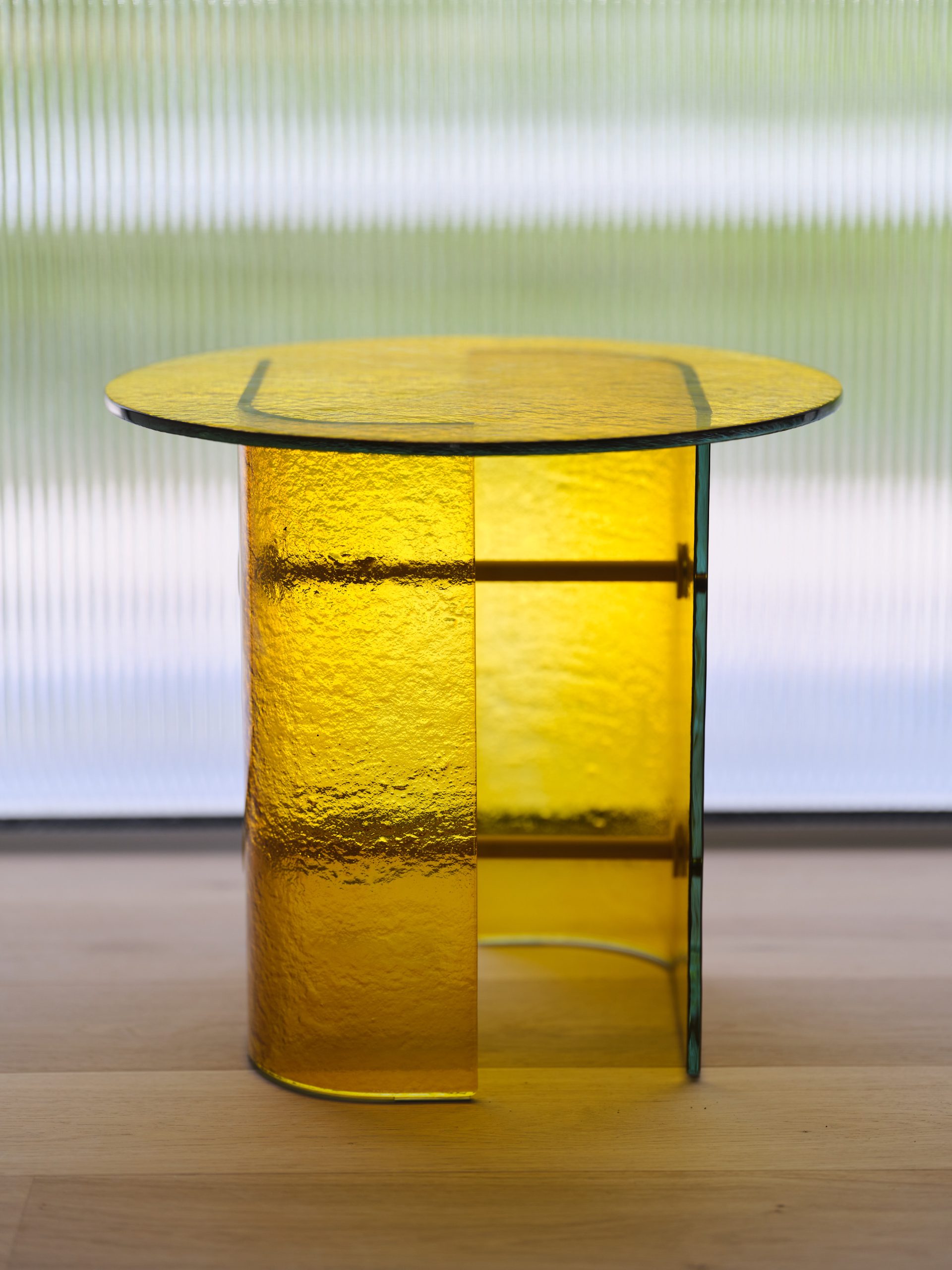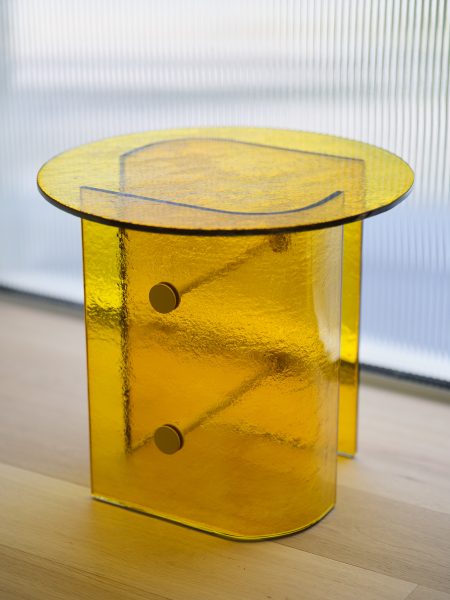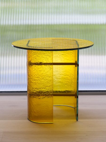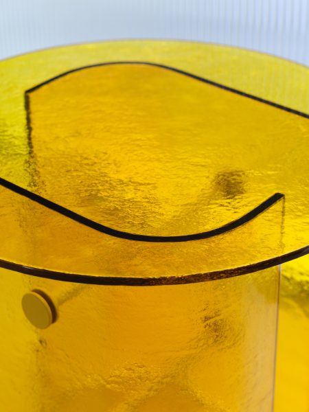 An all-glass design in yellow finish (Connection between the bases in RAL 1005 Painted Metal)