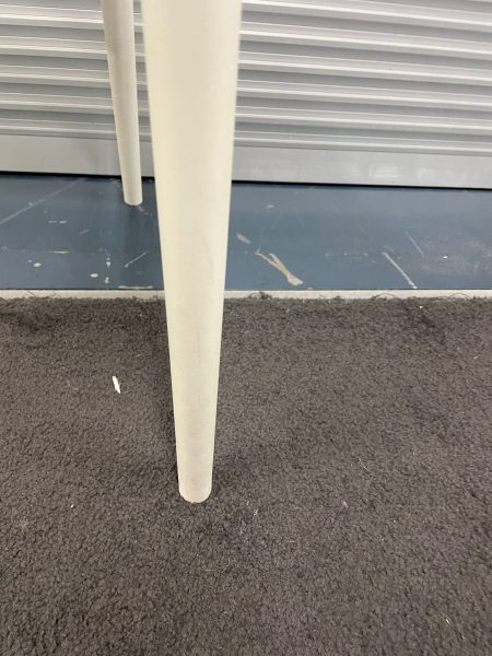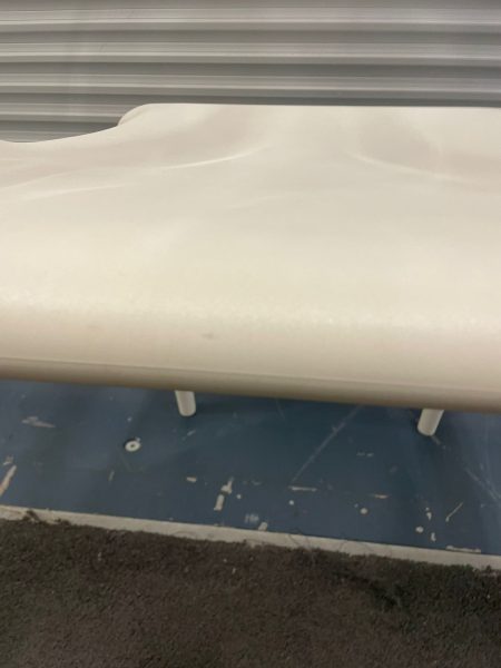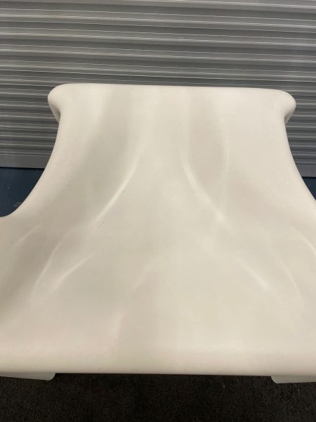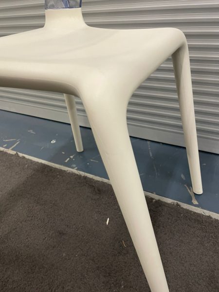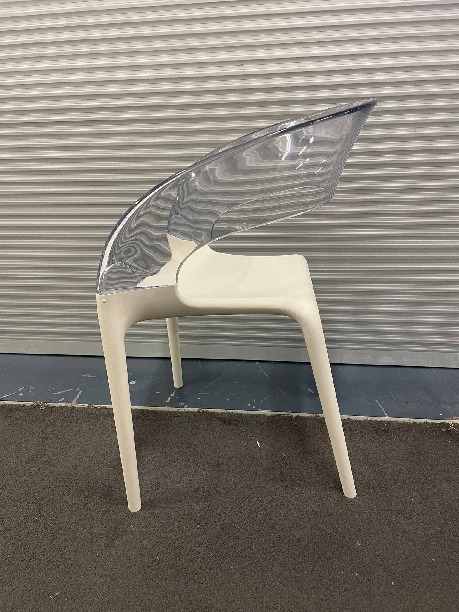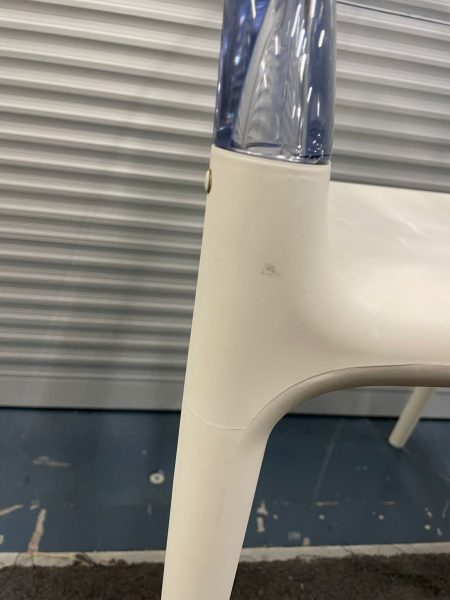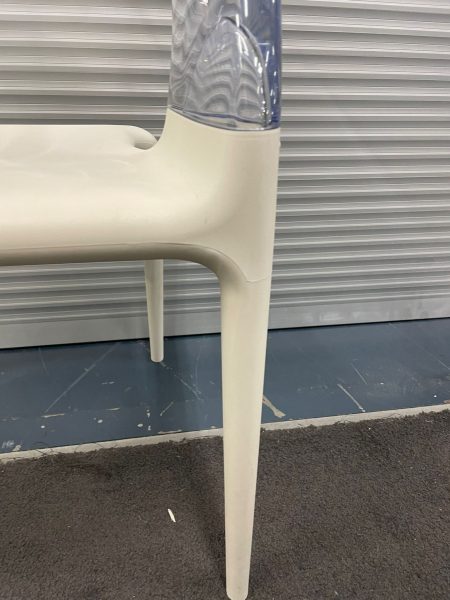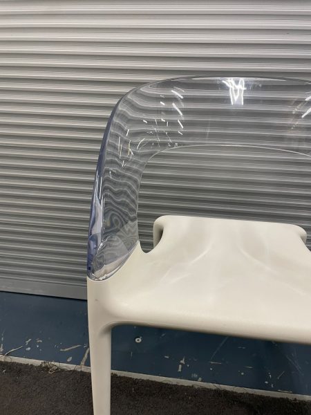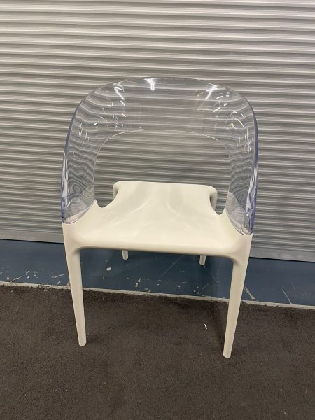 White plastic chair with transparent plastic curved back