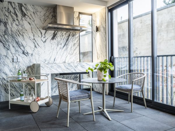 Sage powder coated frame with rope detail armrests and woven back and detachable blue seat cushion