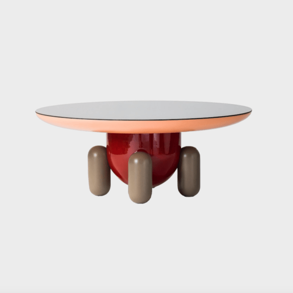 glossy lacquered round coffee table with playful, jelly bean shaped base