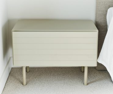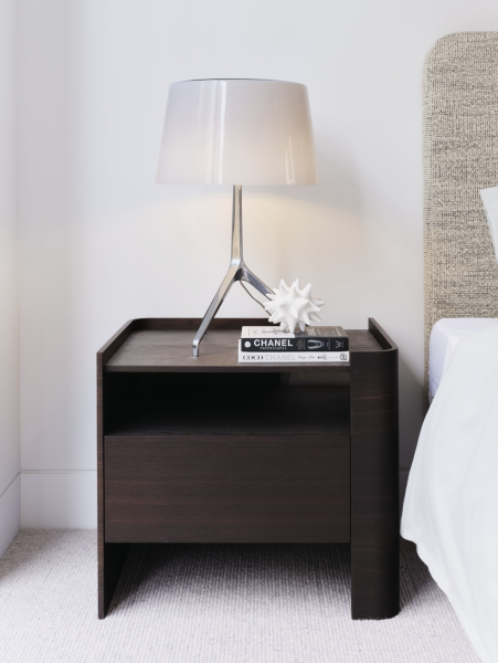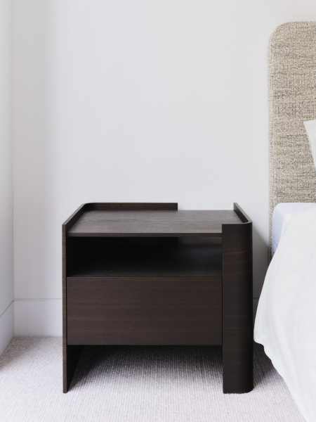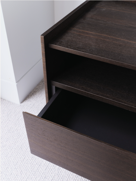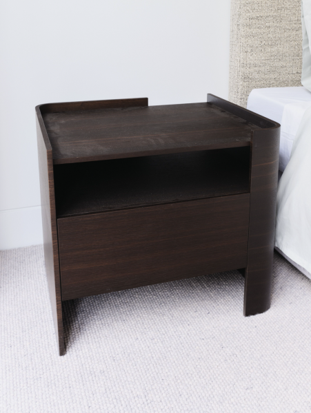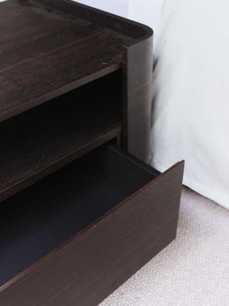 Dark timber side table with curved corners, 1 drawer and open shelf