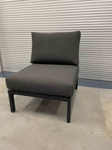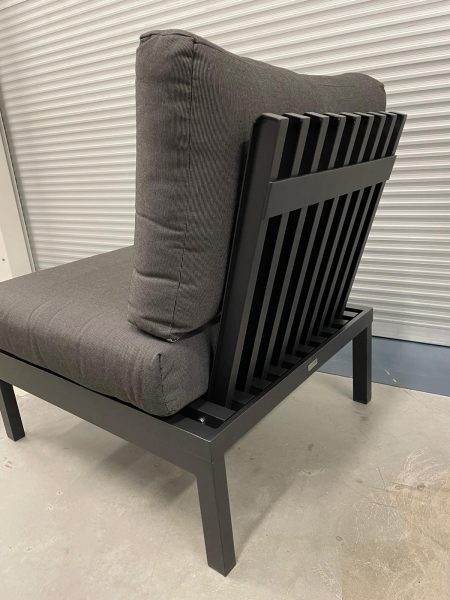 Black slatted convertible chair/ottoman/side table with coal removable cushions