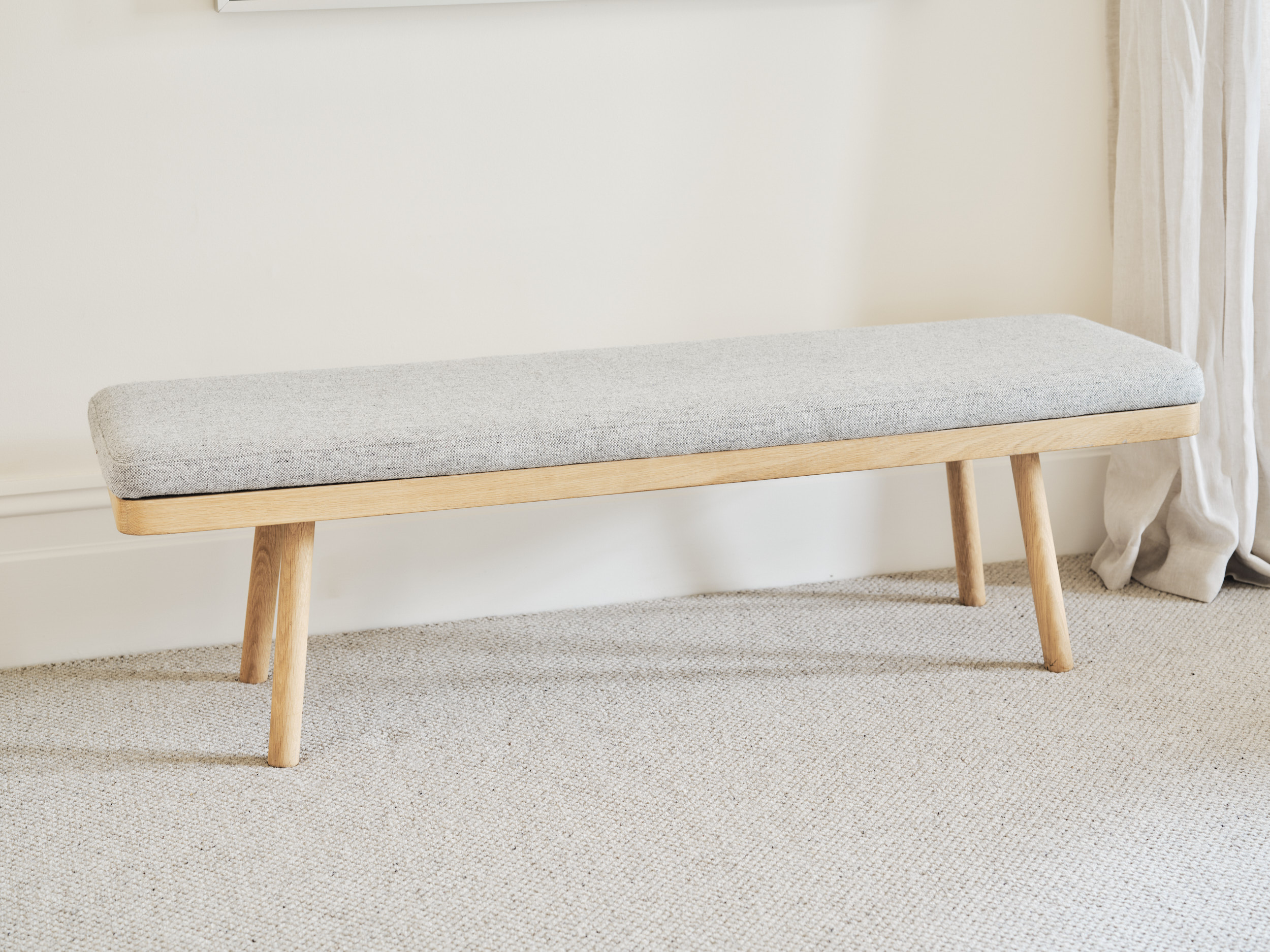 Finn Finn Bench 150cm W x 46cm D x 42cm H Natural timber legs and frame with grey cross hatch upholstered cushion Categories: Bed End Bench, Bedroom Description Description Related products Holland Read more Quick View Barry Read more Quick View Matrix Read more Quick View