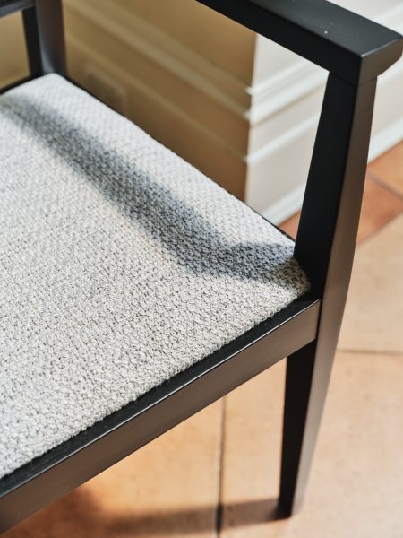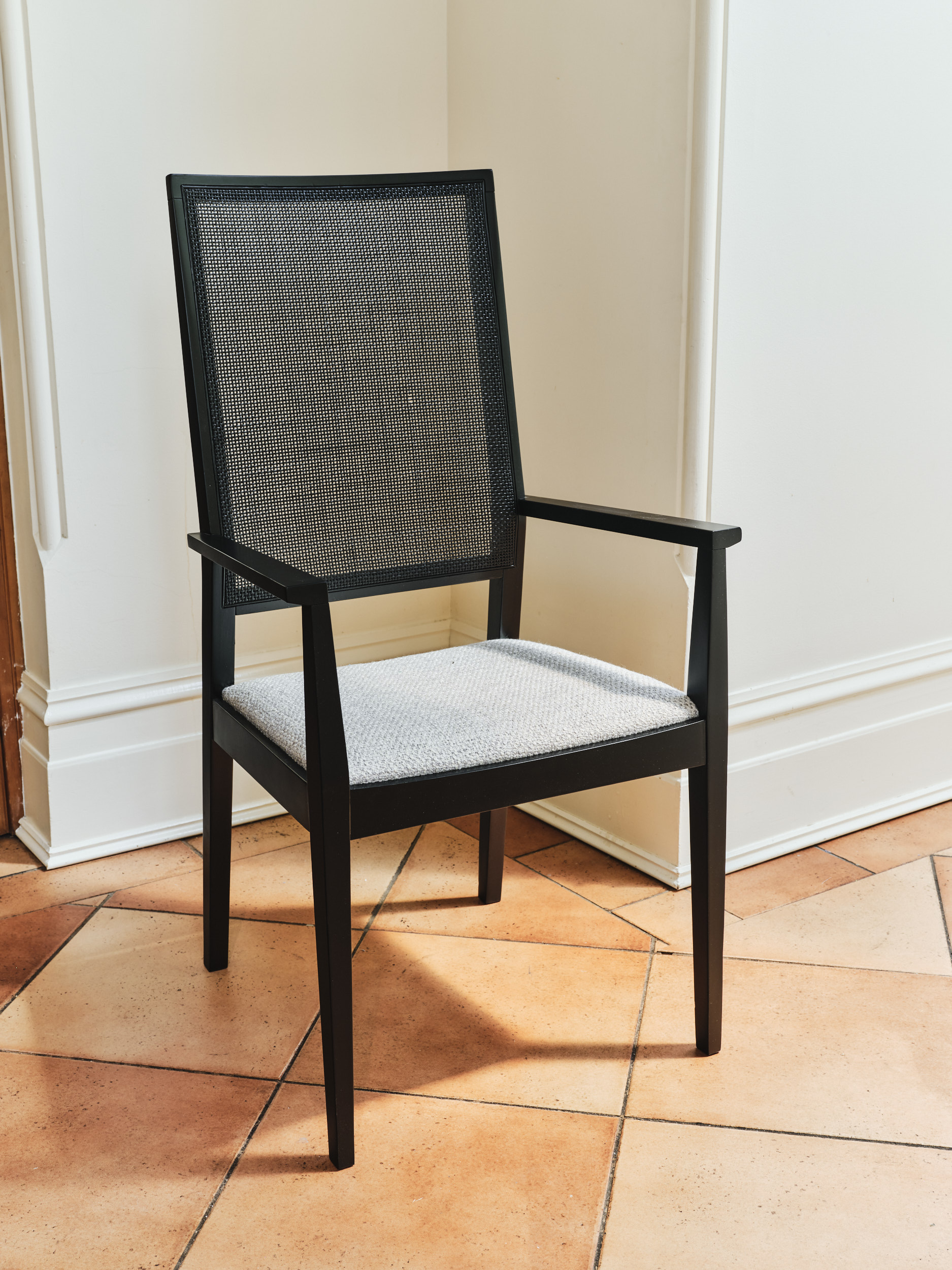 Harwood Harwood Arm Dining Chair Black Stained Timber Frame with cane back and grey upholstered seat Categories: Dining, Dining Chair Description Description Related products Vessel Read more Quick View Container Read more Quick View Container Read more Quick View