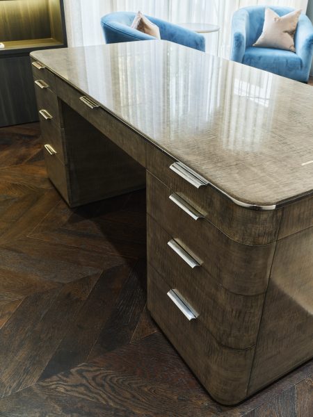 Desk with brushed stainless steel hardware, maple veneer and layered oak