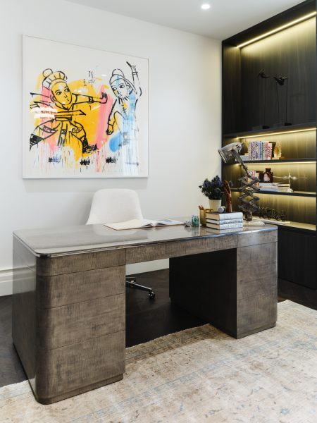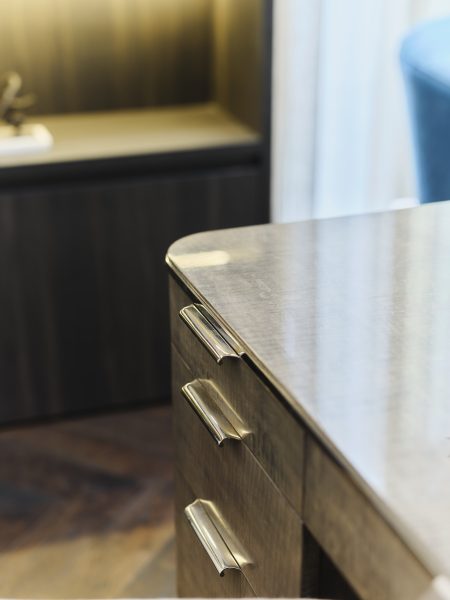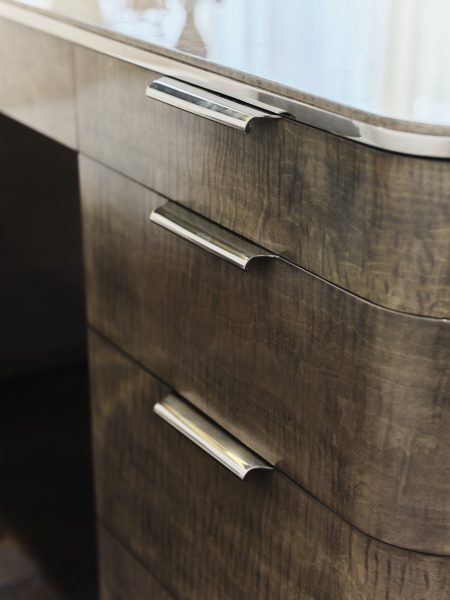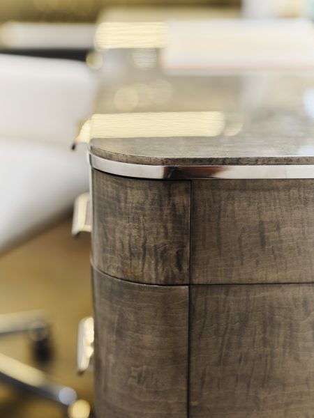 Desk with brushed stainless steel hardware, maple veneer and layered oak