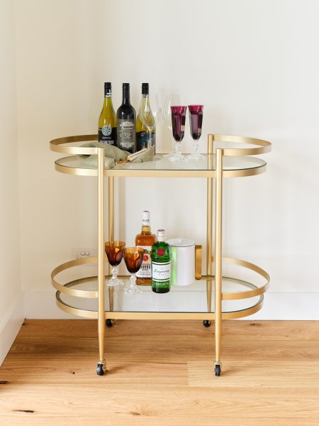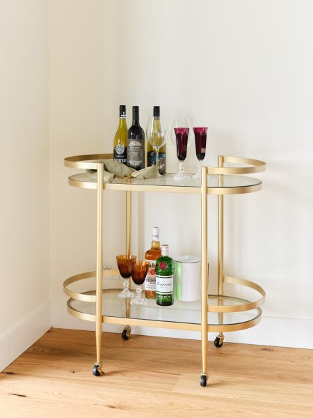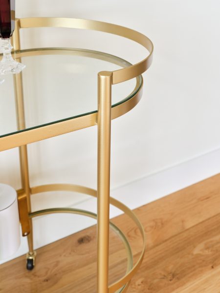 Isabelle Isabelle Bar Cart 86.5cm W x 45.5cm D x 76.2cm H Brass pill shaped bar cart with clear glass shelves Categories: Dining, Trolley Description Description Related products Jil Read more Quick View Good One Read more Quick View Sir Gio Read more Quick View