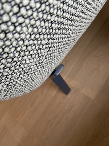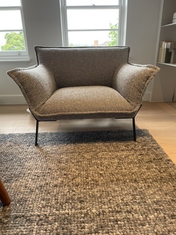 Khaki/white boucle fabric oversized occasional chair on blue metal frame
