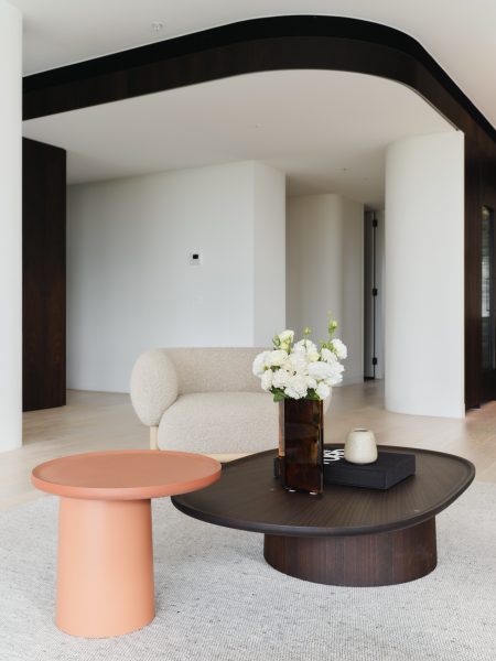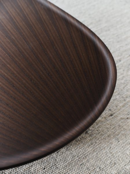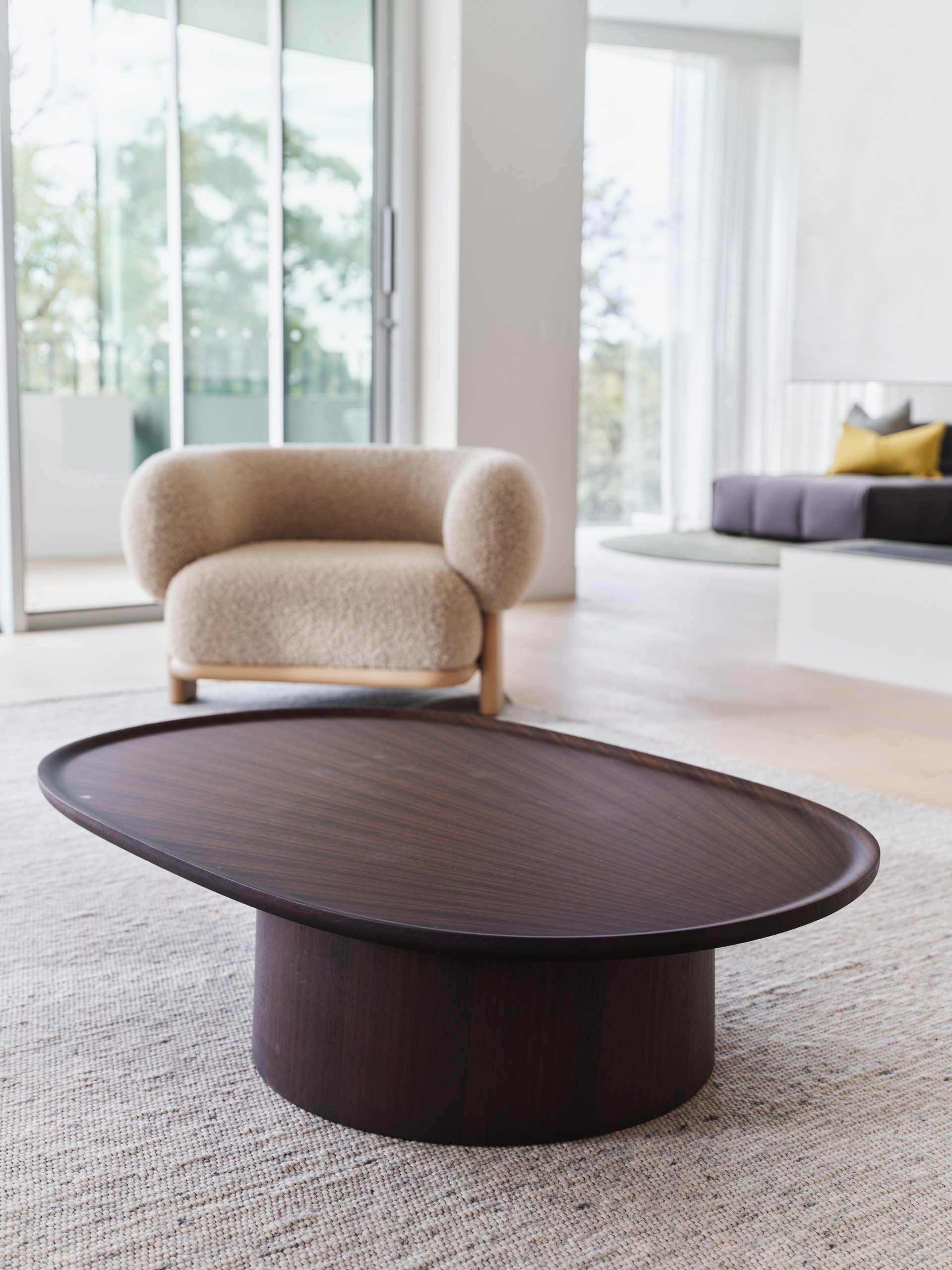 Eucalyptus wood circular structure on top and pedestal base with conical central plinth.