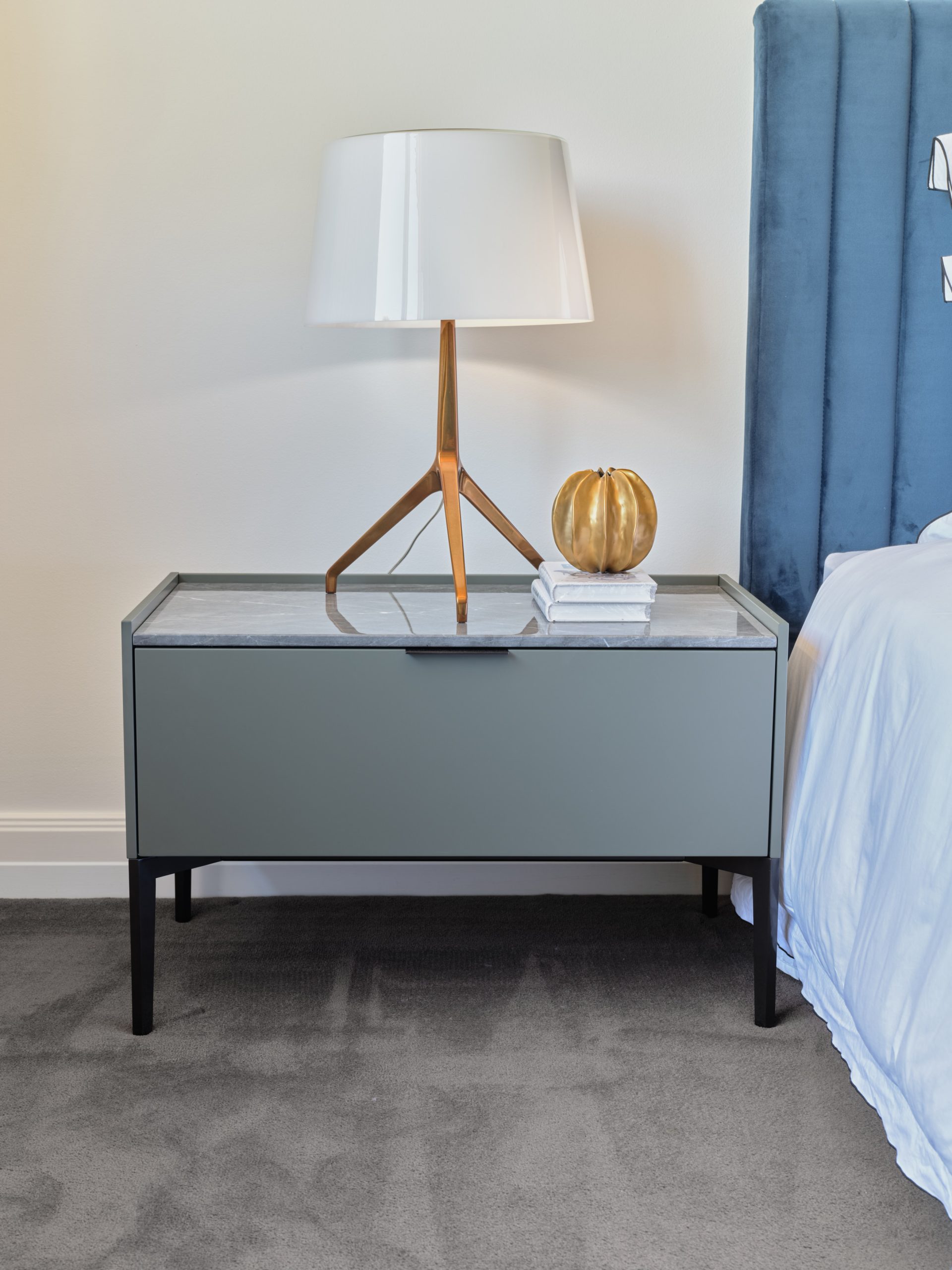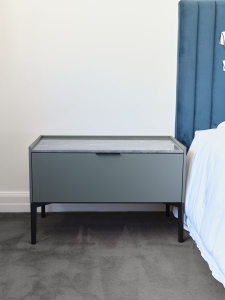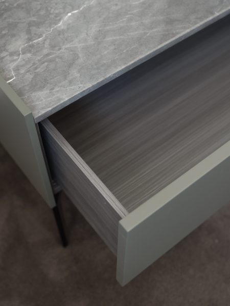 Pine green lacquer finish with charcoal melamine legs and galaxy grey marble top.