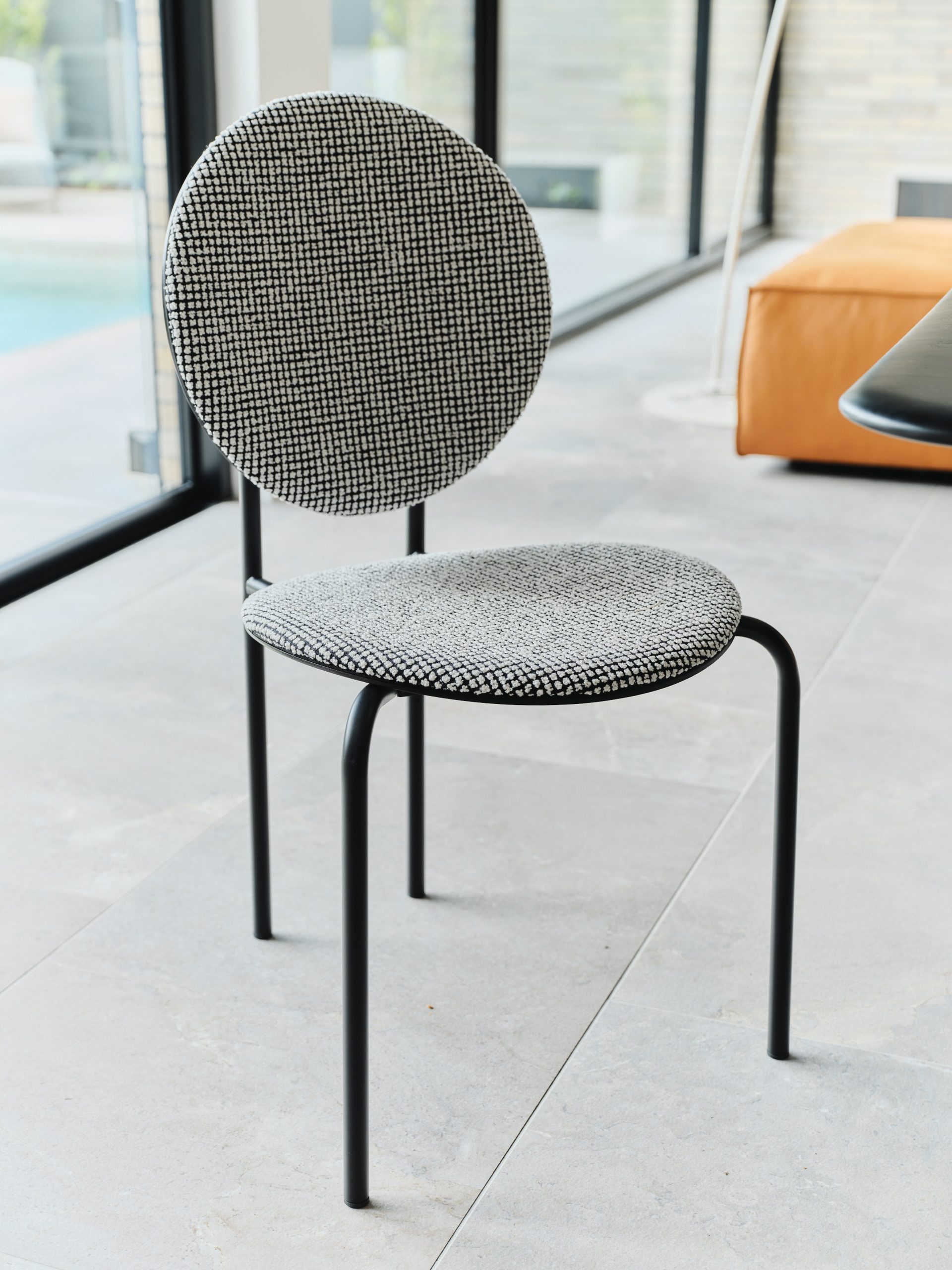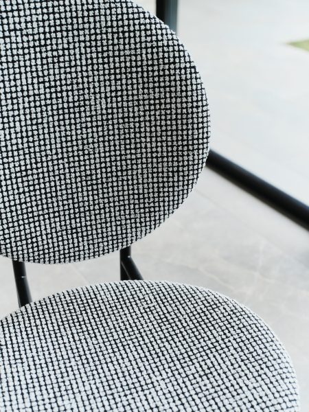 Black/White fabric upholstered seat and back on satin black frame