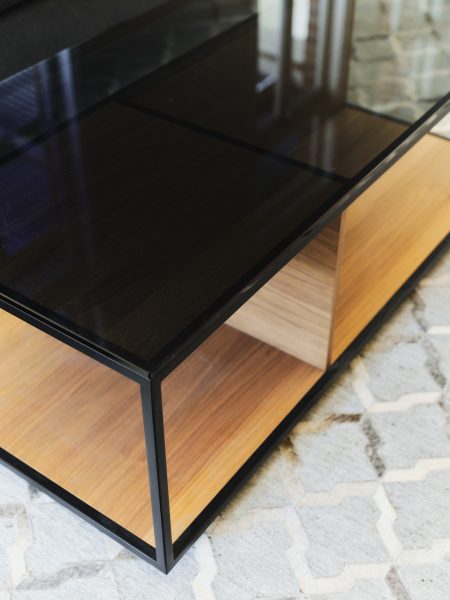 Black lacquered metal structure with walnut base and internal dividers and smoke glass top.