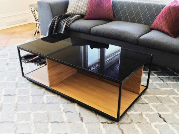 Black lacquered metal structure with walnut base and internal dividers and smoke glass top.