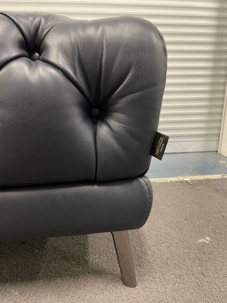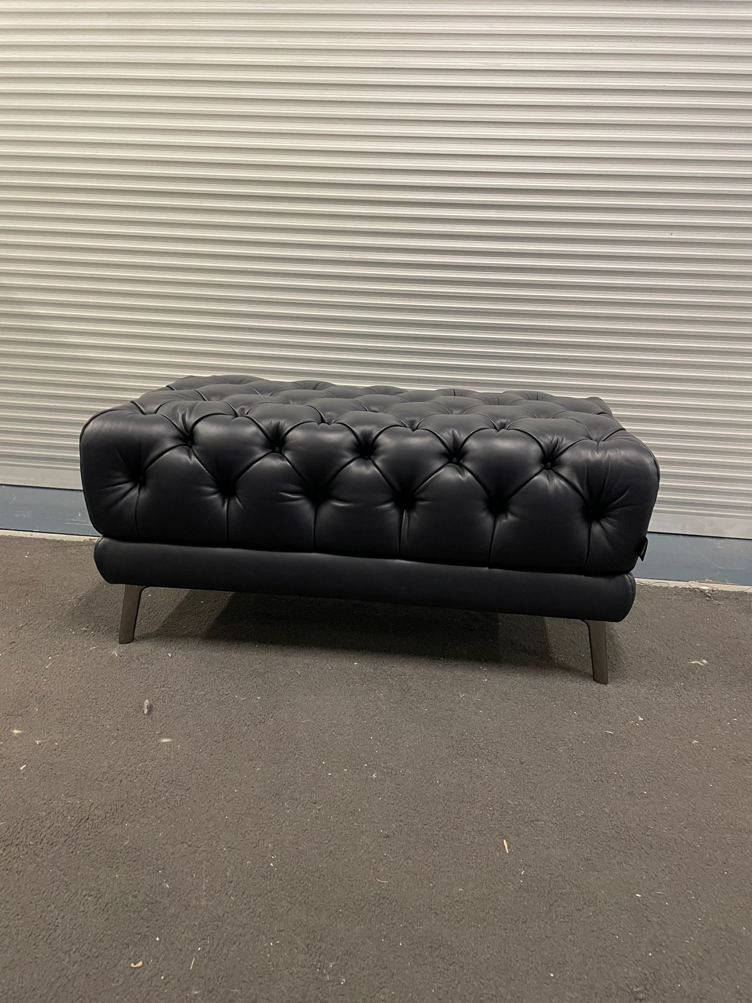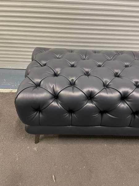 Dark navy blue Leather upholstered button detail ottoman with black metal legs