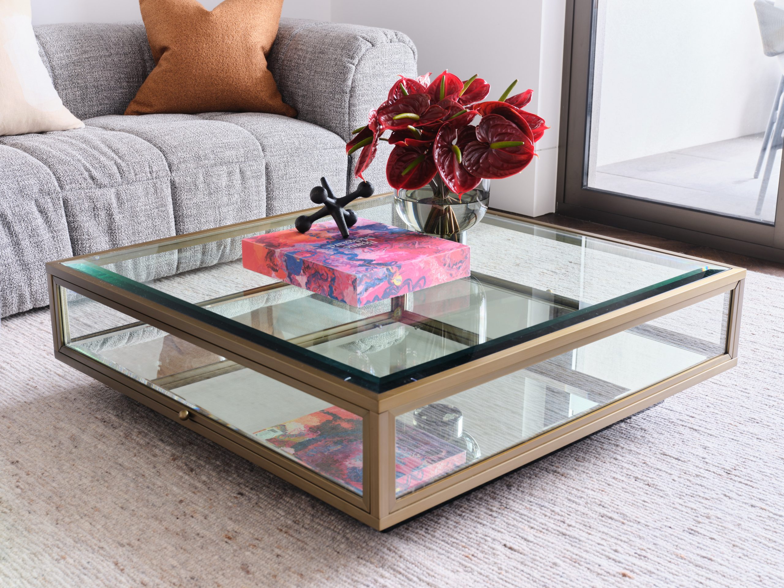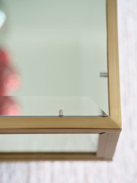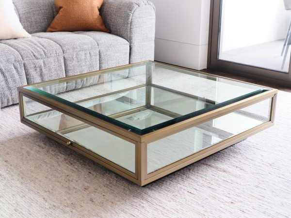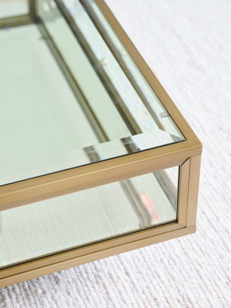 Glass & brushed brass square coffee table with mirrored base