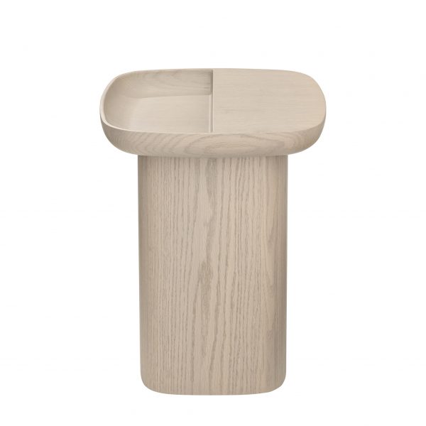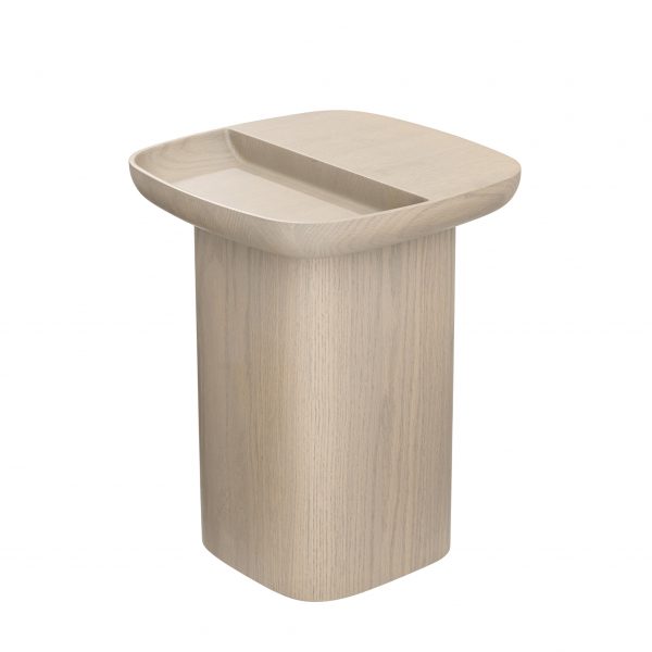 White oak square top with rounded edges and cut out detail on solid pedestal