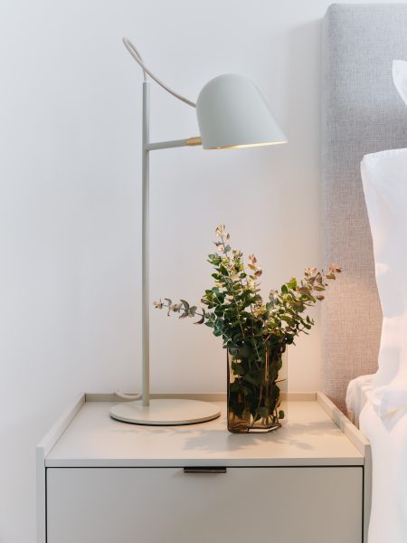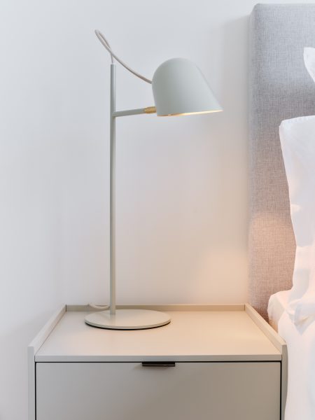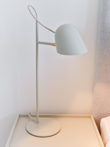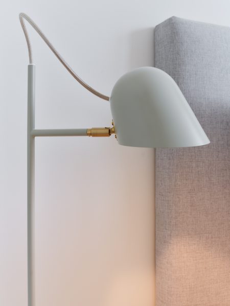Minimalist design with a slender frame and gently curved shade, finished in warm grey.