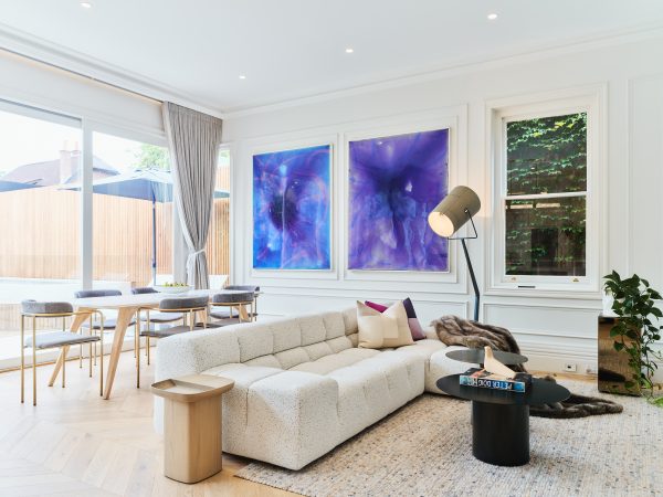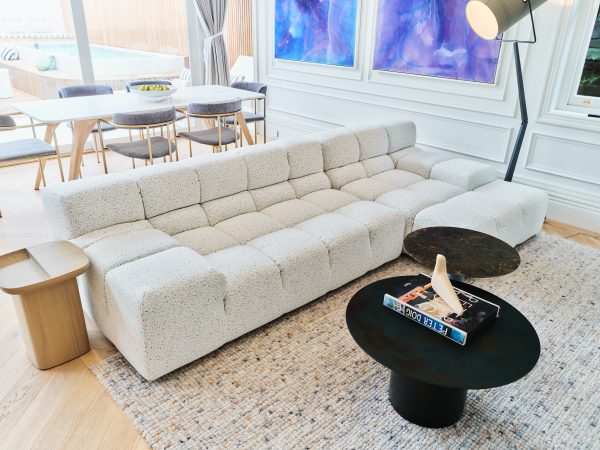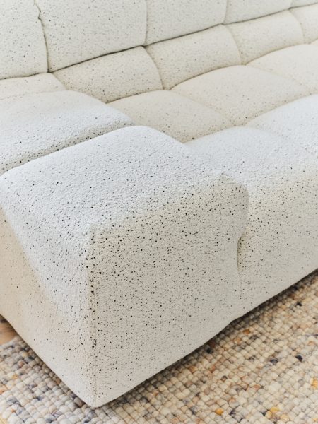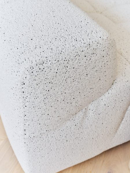 Black/White Boucle upholstered modular sofa with square padded detail and left chaise