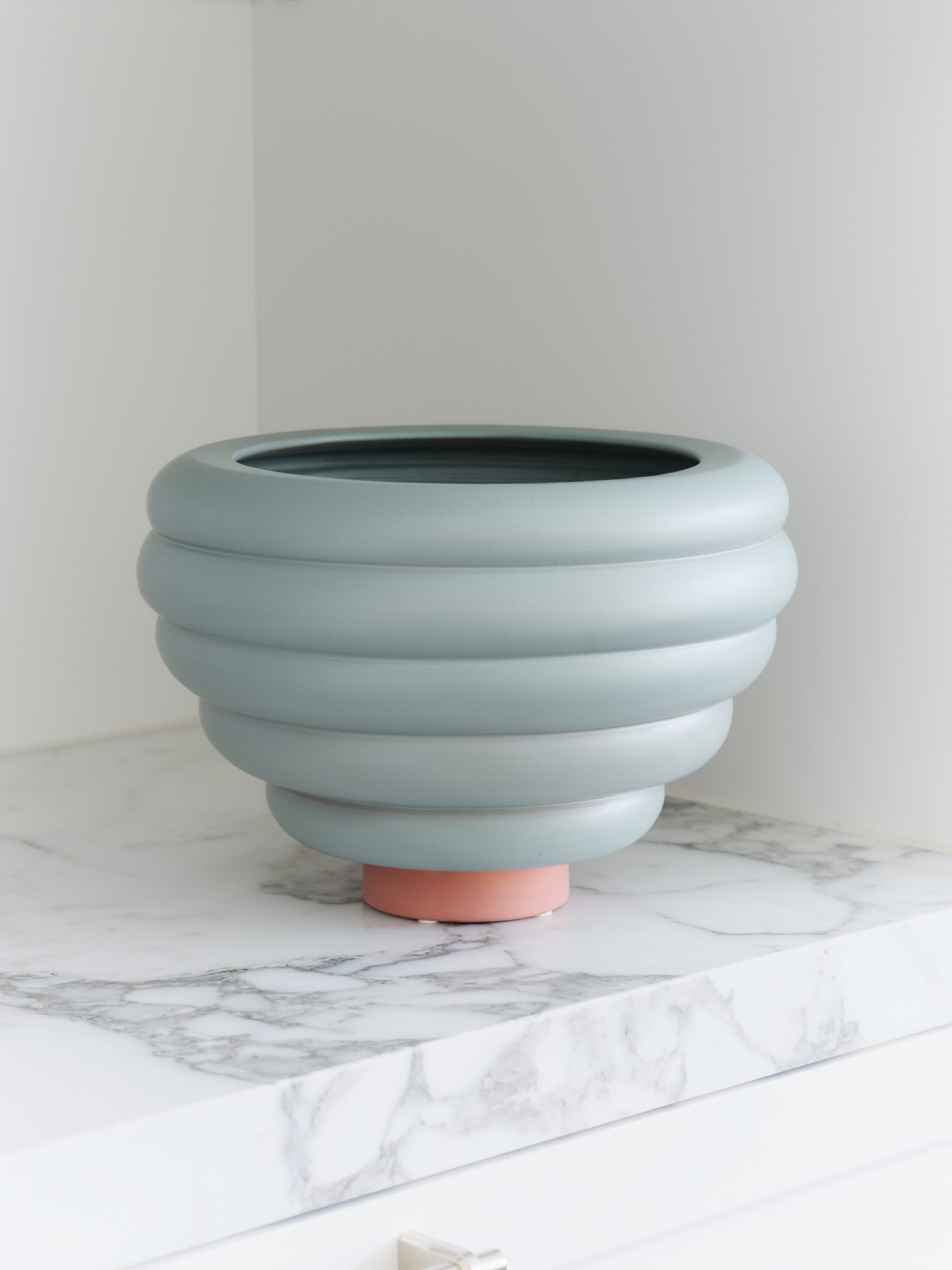 Vase 1665 Gino Vase by Rometti X SP01 30cm Diam x 20.5cm H Green rounded ripple bowl shape on pink foot glazed terracotta Categories: Accessories, Vase Description Description Related products Exotic Cushion – Brown Read more Quick View Basket 1009 Read more Quick View Brick Cushion – Blue Read more Quick View