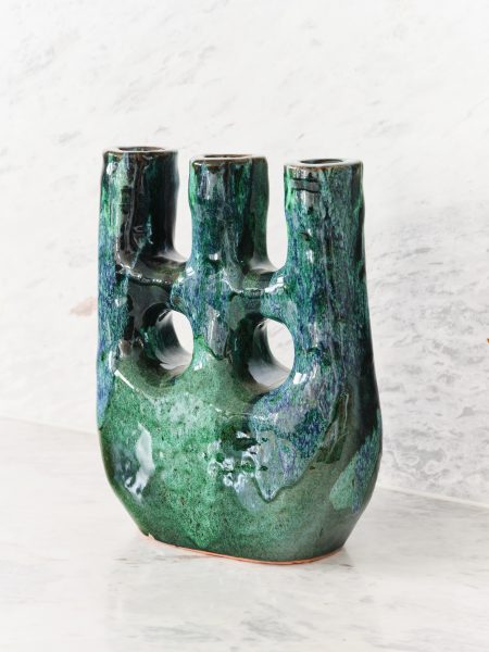 Enamelled terracotta vessel with 3 bottlenecks and 2 cut out holes