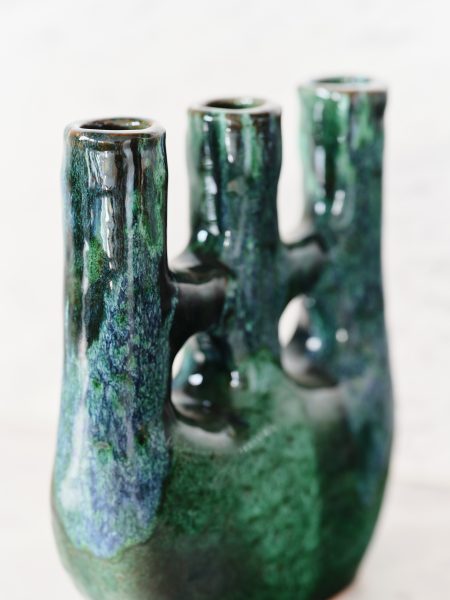 Enamelled terracotta vessel with 3 bottlenecks and 2 cut out holes
