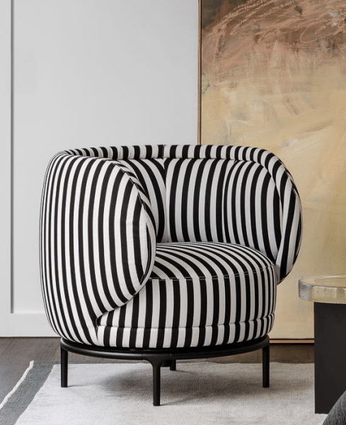 Vuelta Vuelta by Wittman 80cm W x 83cm D x 77cm H Black and white striped fabric swivel chair with black legs Categories: Living, Occasional Chair Description Description Related products Togo Read more Quick View Bigger Read more Quick View Pukka Read more Quick View